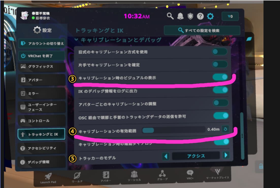 【キャリブレーション時のビジュアルの表示】をオンにすると、認識されて接続されるトラッキングポイントが見えます。